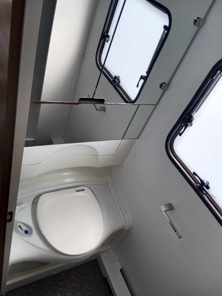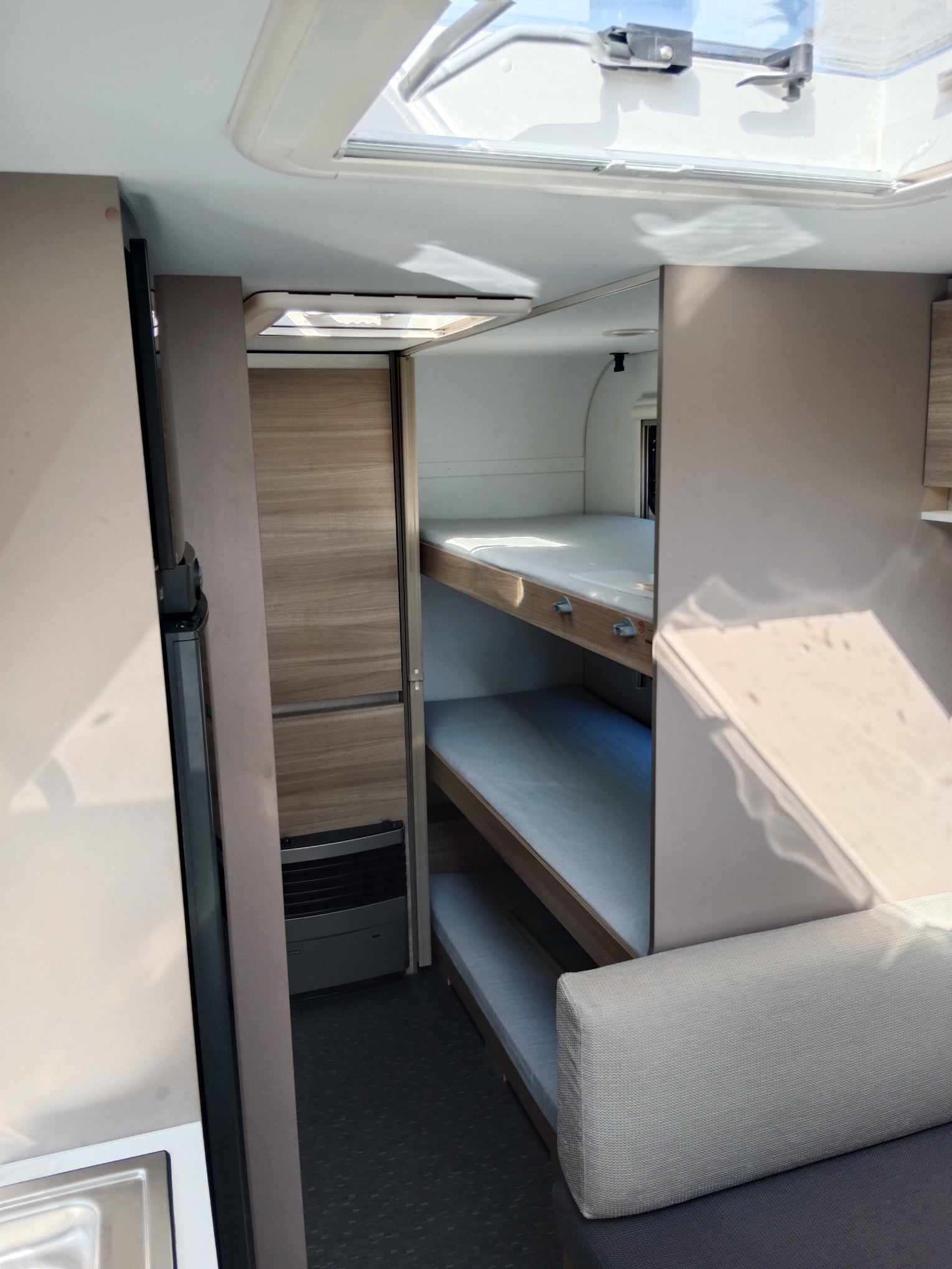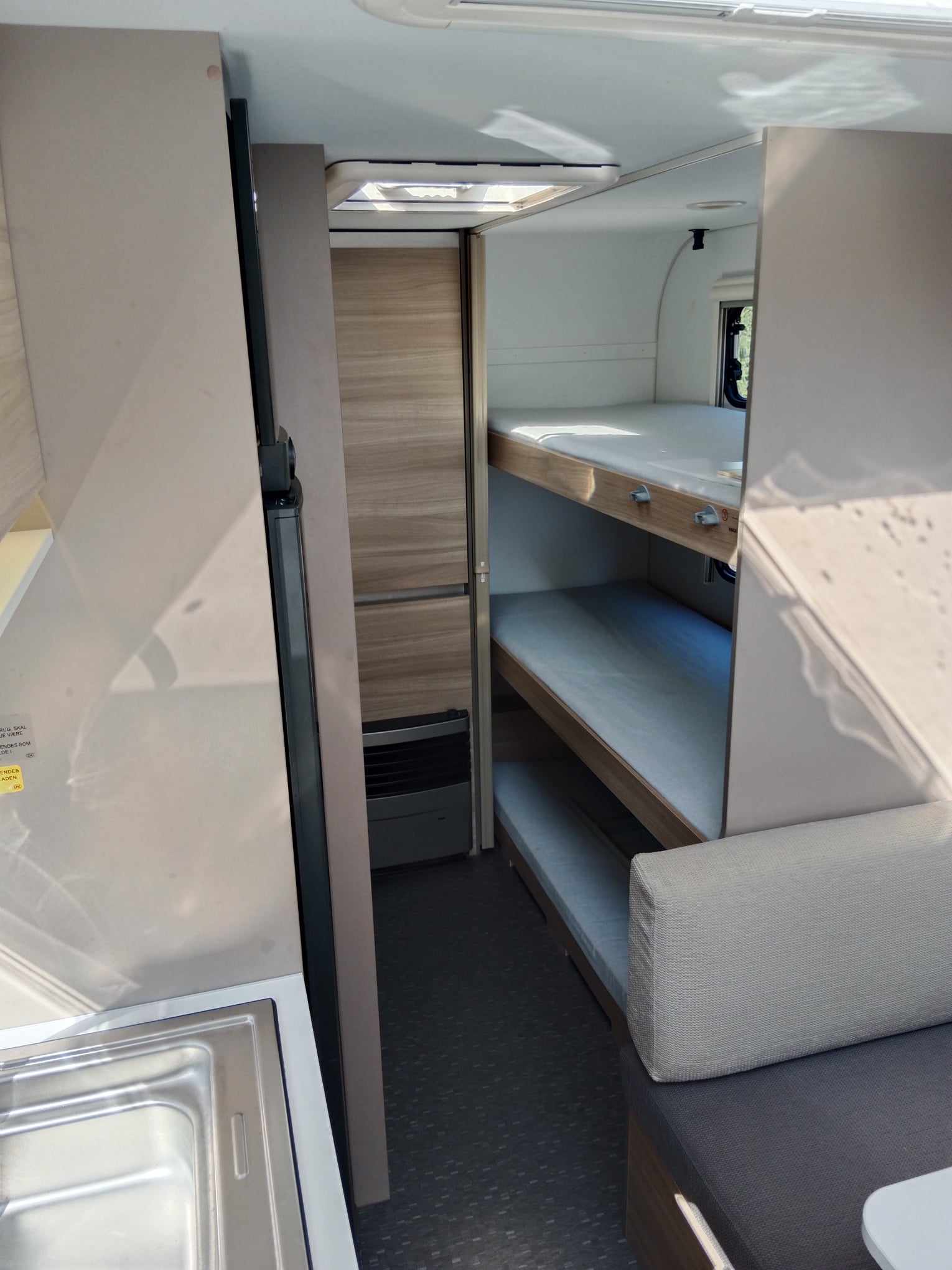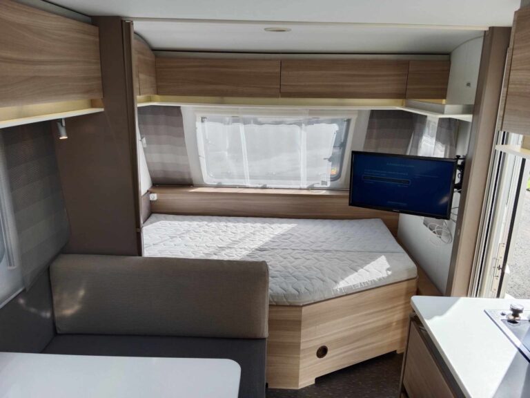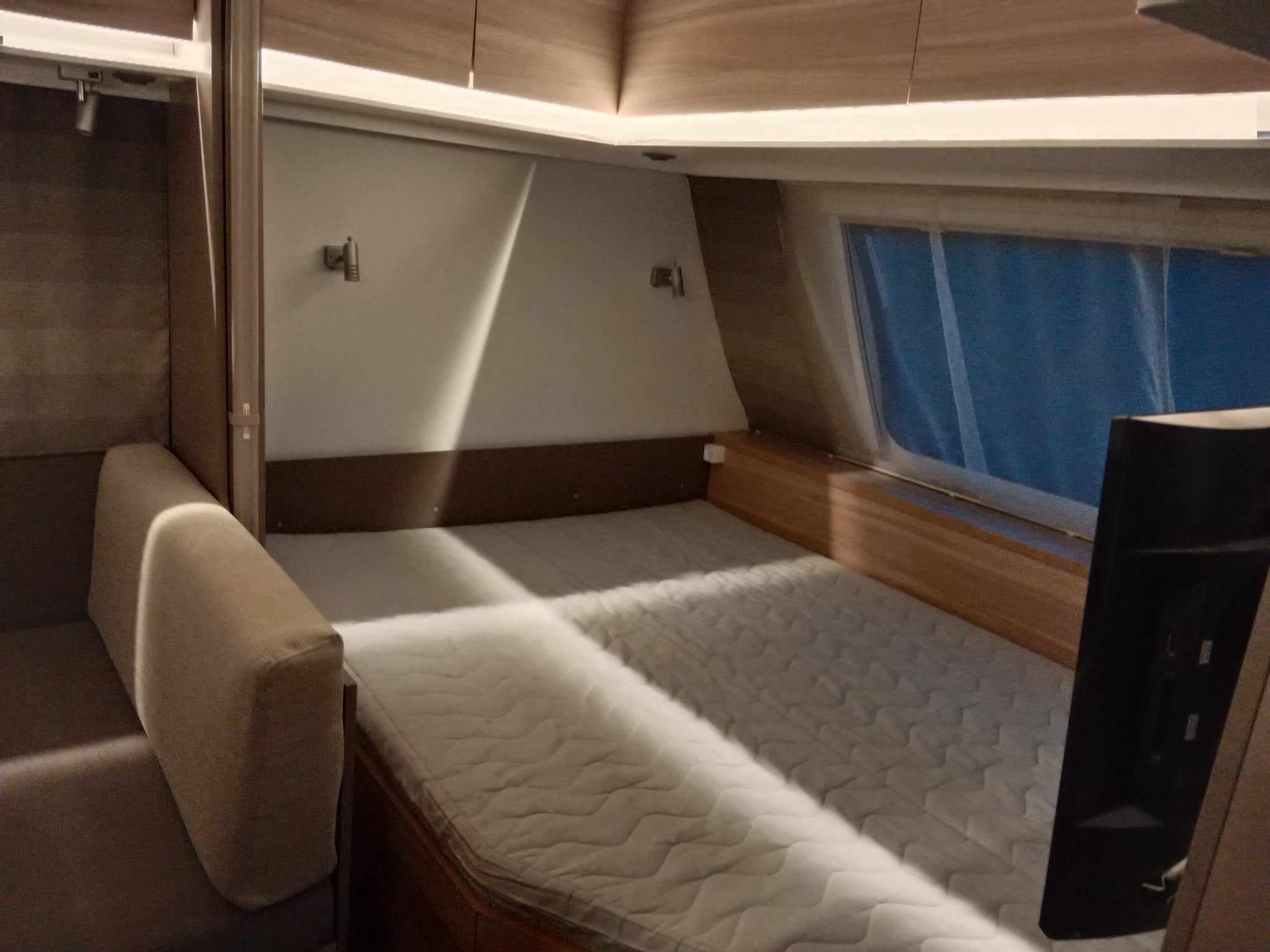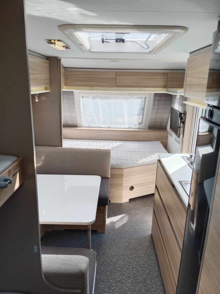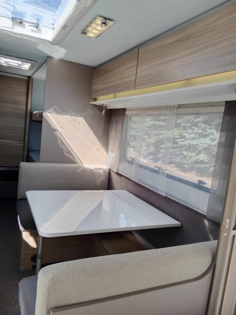 Uprostřed sezení které se dá rozložit na spaní , kuchyň z velkou 150l lednicí . Na zádi 3 palandy se samostatným sprchovým koutem, prostorné WC s umyvadlem.