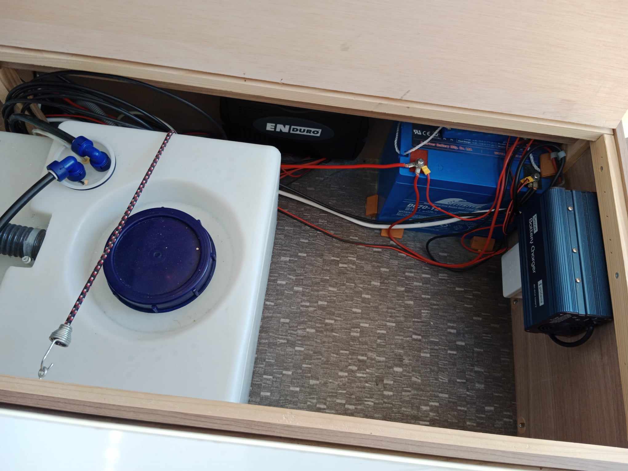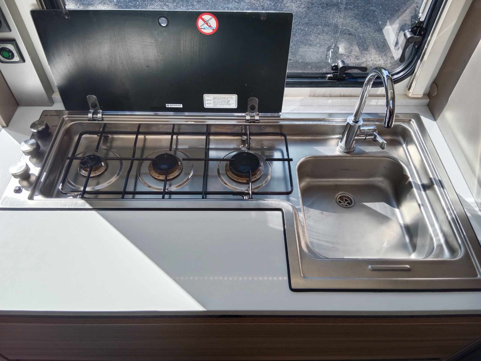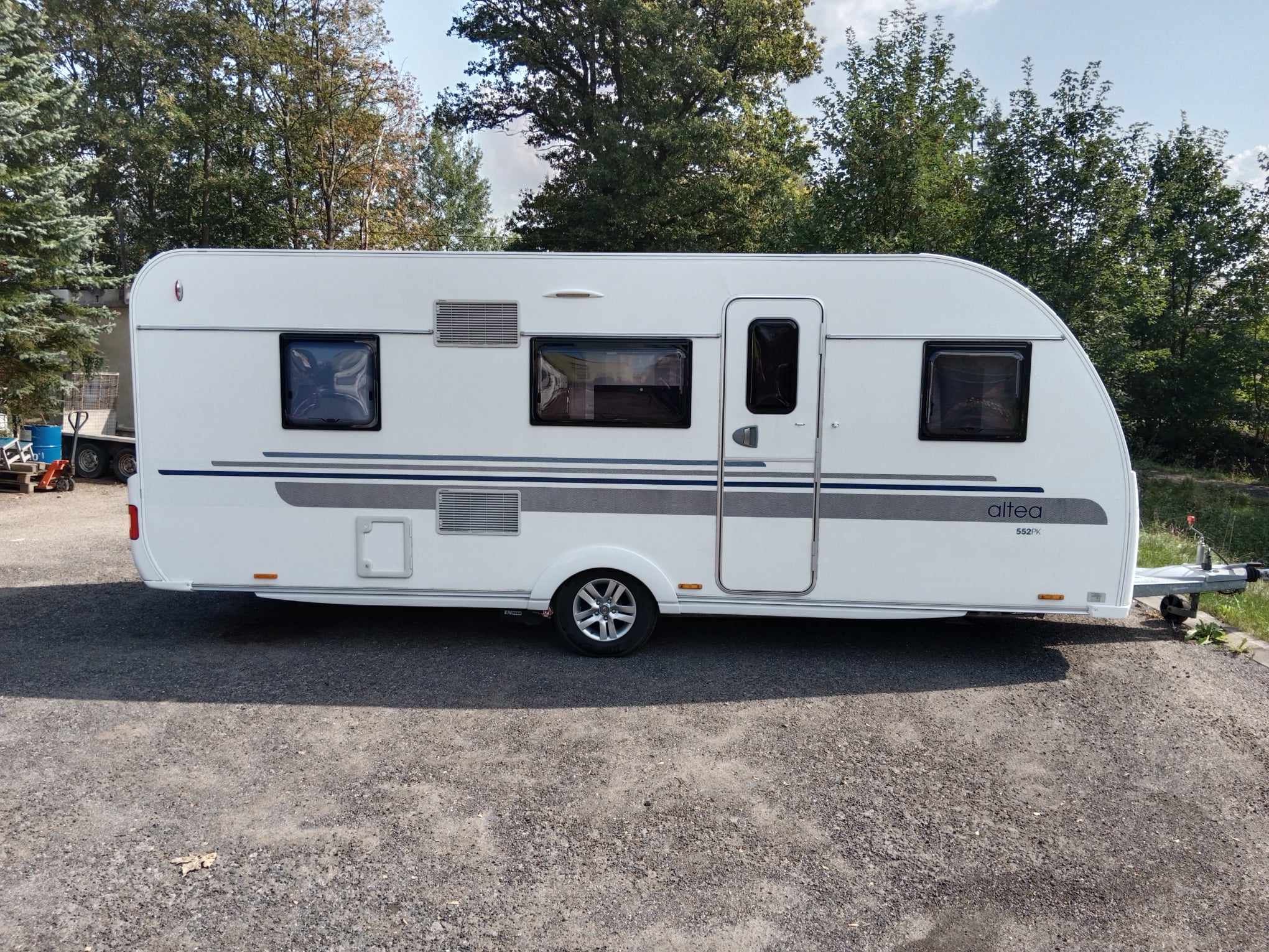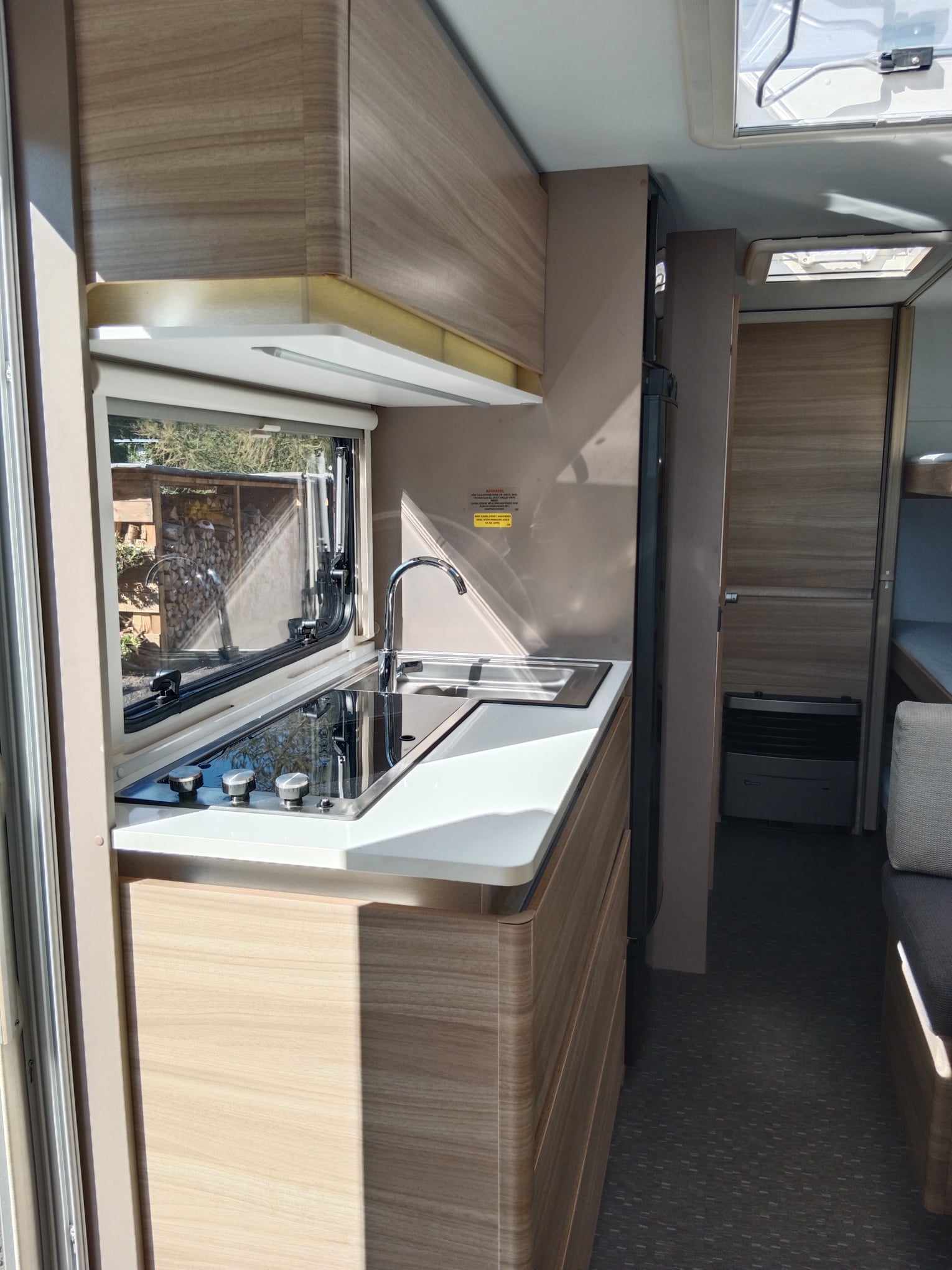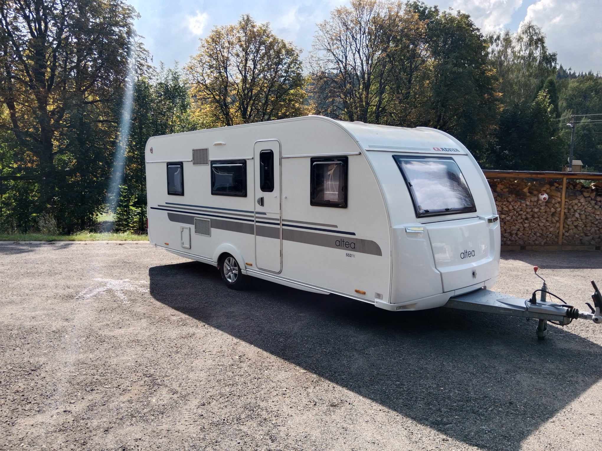 Uprostřed sezení které se dá rozložit na spaní , kuchyň z velkou 150l lednicí . Na zádi 3 palandy se samostatným sprchovým koutem, prostorné WC s umyvadlem.