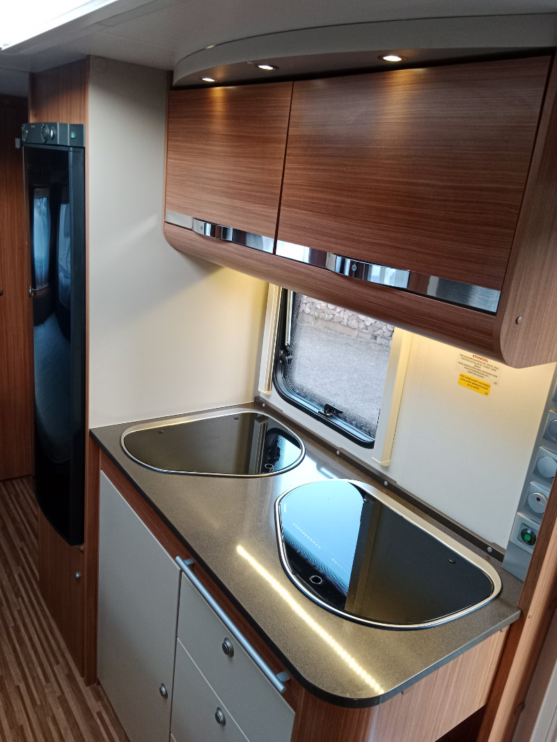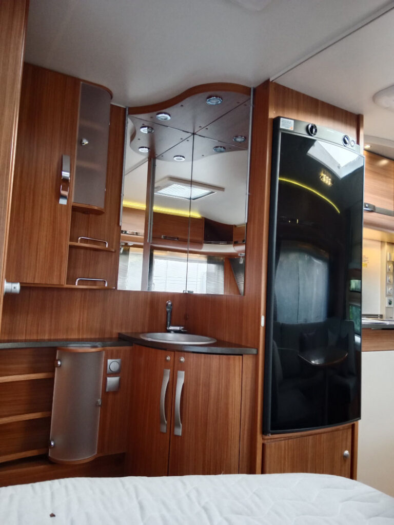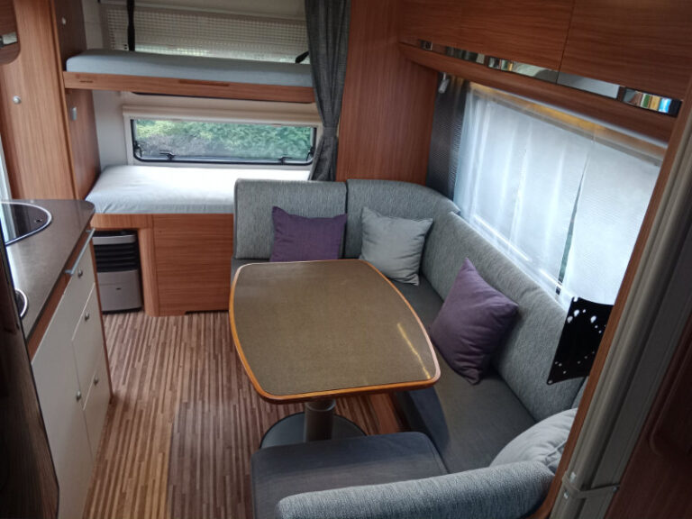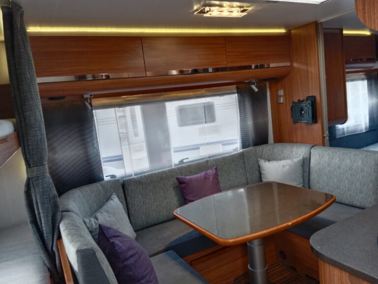 Uprostřed velké sezení do U které se dá jednoduše rozložit na spaní . Na zádi 2 palandy s velkým úložným prostorem.