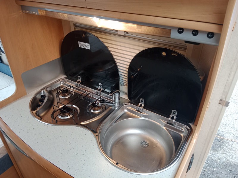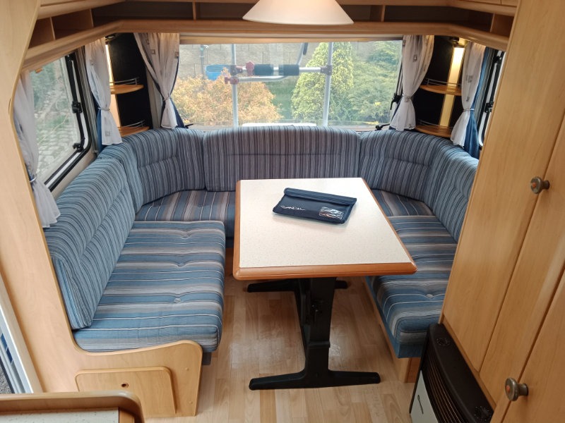 Na zádi sezení do U, které se dá rozložit na spaní. Na přídi pevné lůžko, uprostřed koupelna se záchodem.