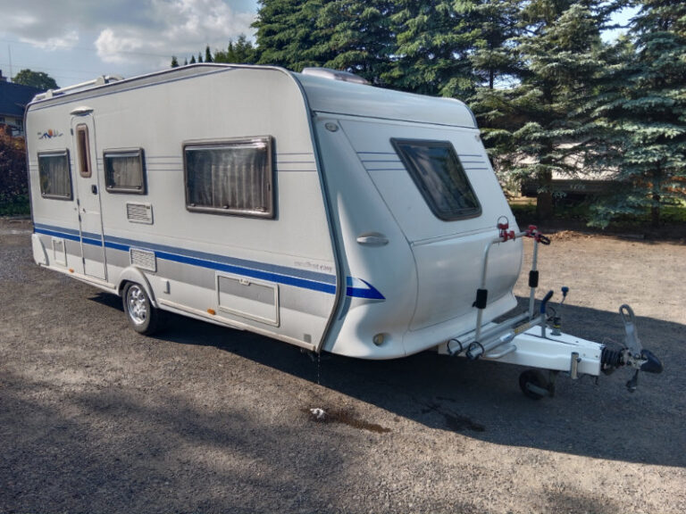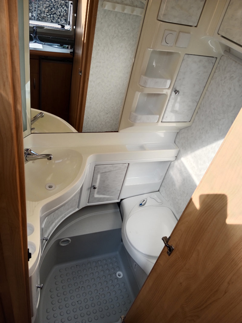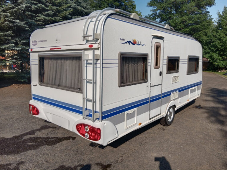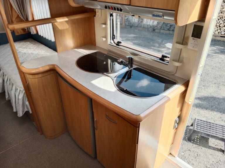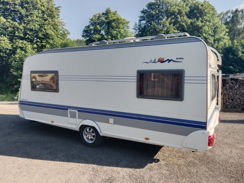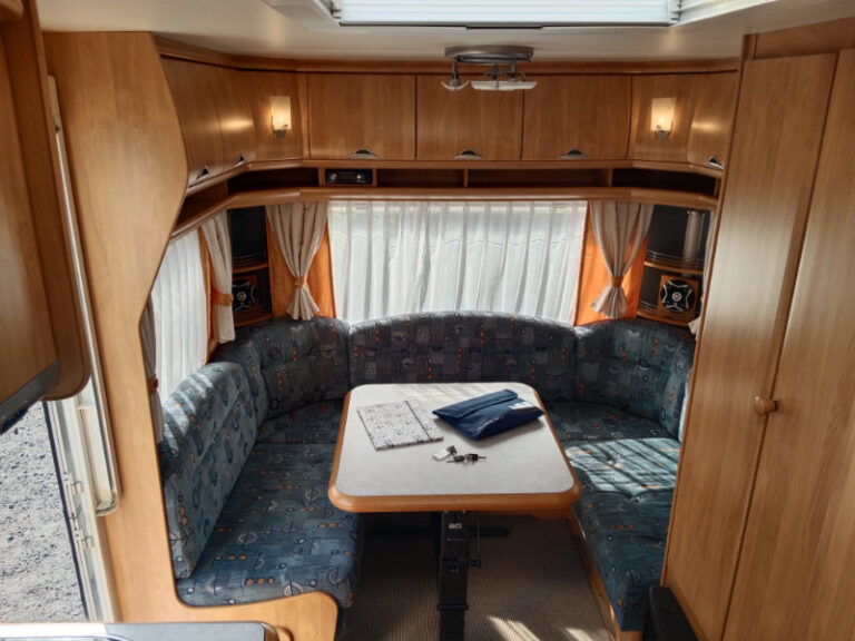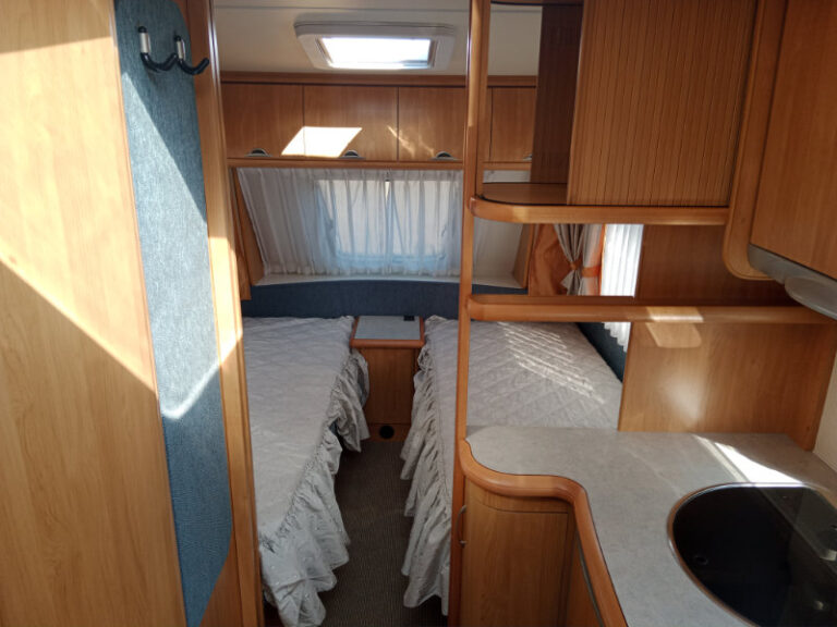 Na zádi sezení do U, které se dá jednoduše rozložit na spaní . Uprostřed kuchyň, záchod, sprcha.