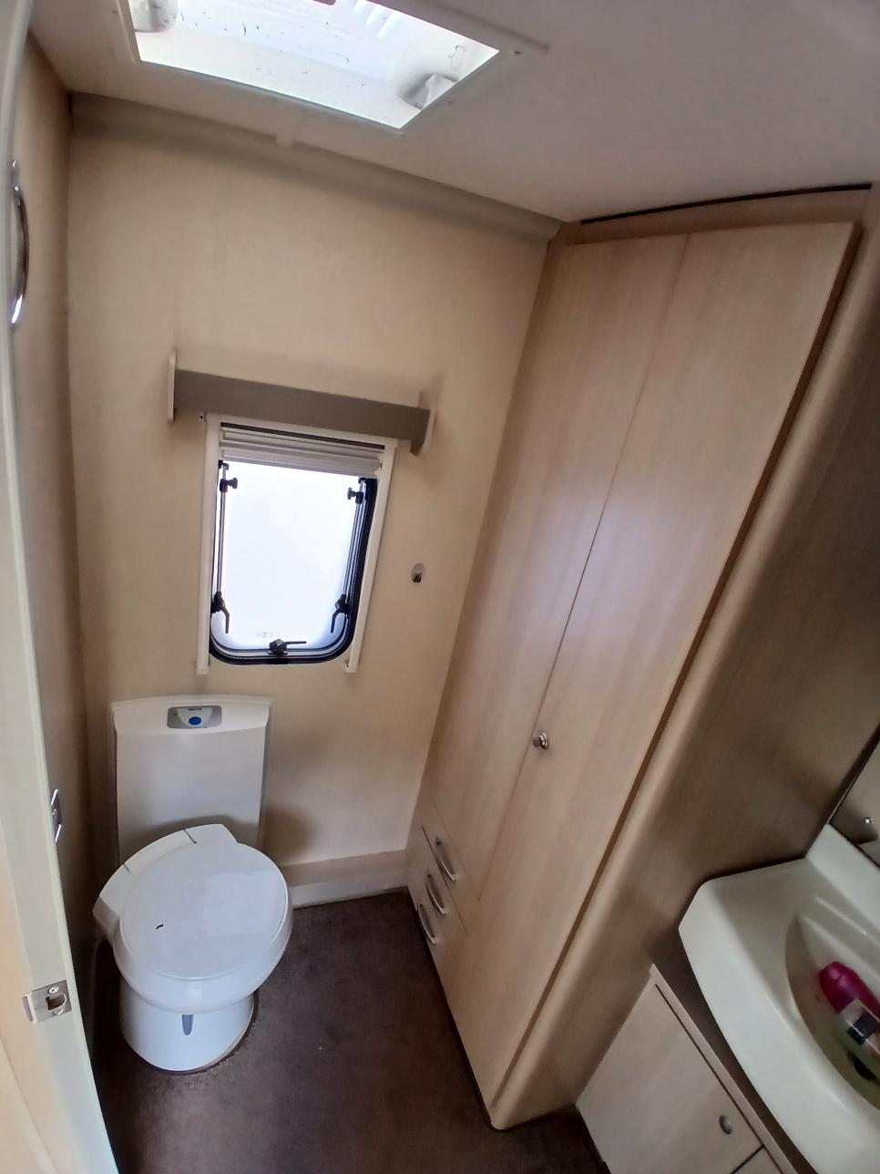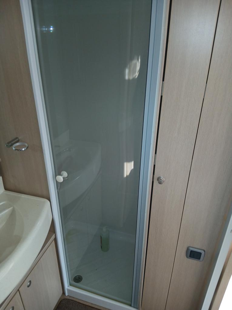 Na zádi velká koupelna s toaletou a sprchovím koutem .
